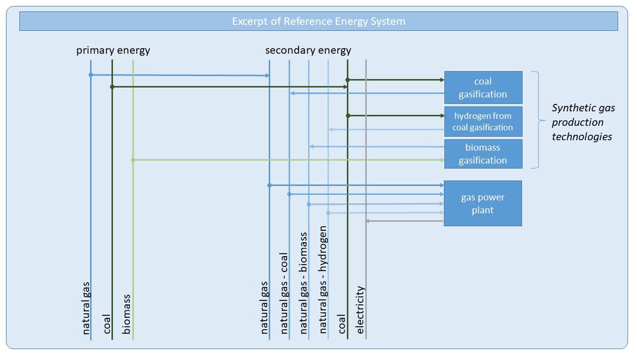 Natural gas can be blended with hydrogen or with synthetic gas derived from the gasification of biomass or coal (cf. Section Other conversion). Despite the fact that in the real world, hydrogen or other synthetic gases are physically injected into a natural gas network, it is important to be able to track the use of blended fuels in the energy model for two reasons. Not all blended fuels can be used equally within all natural gas applications. For example, hydrogen mixed into the natural gas network is restricted to use in non-CCS applications only. Secondly, it is essential to keep track of where which of the blended fuels is being used in order to correctly report emissions and also to potentially restrict the degree to which fuels can be blended for individual applications. For example, natural gas end-use appliances may only be able to cope with a certain share of hydrogen while still guaranteeing their safety and longevity. Similarly, for policy analysis, it could be required that a certain minimum share of a synthetic gas is used sector specifically.