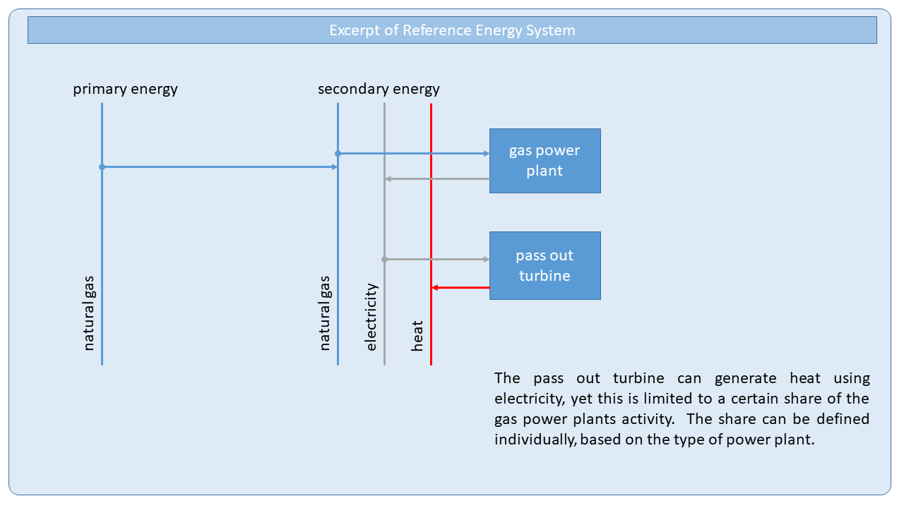 In the global model, there are numerous electricity generation technologies (cf. Section Electricity). A separate technology, known as a pass out turbine, is represented in the model to provide select electricity generation technologies the option to reduce their electricity output in favor of generating electricity and heat. The pass out turbine, which is a steam turbine in which a certain amount of the pressurized steam is passed out of the turbine for the purpose of heat production, is restricted to a share of the activity of the selected electricity generation technologies. Technically, this means that the electricity output of the electricity generation technologies remains unaltered, yet each unit of heat generated by the pass out turbine, requires a certain electricity input. The figure below is an excerpt of the Reference Energy System (RES), showing how the pass-out turbine is modelled.