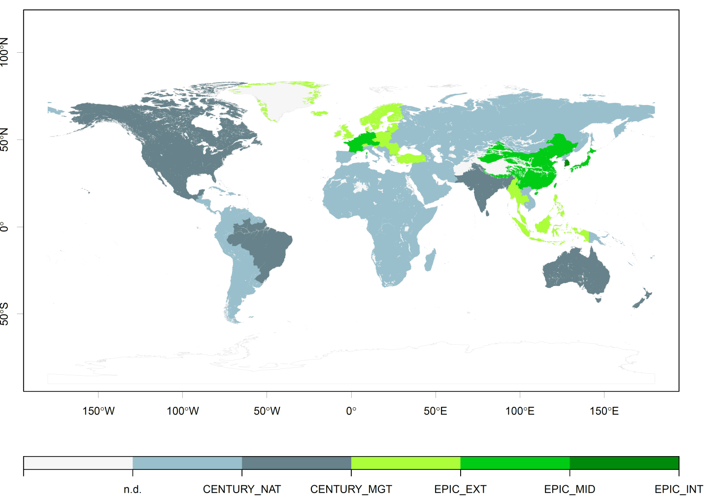 Fig. 20 Data sources used to parameterize forage availability in different world regions. CENTURY_NAT – CENTURY model for native grasslands; CENTURY_MGT – CENTURY model for productive grasslands; EPIC_EXT – EPIC model for grasslands under extensive management; EPIC_MID – EPIC model for grasslands under semi-intensive management; EPIC_INT – EPIC model for grasslands under intensive management.