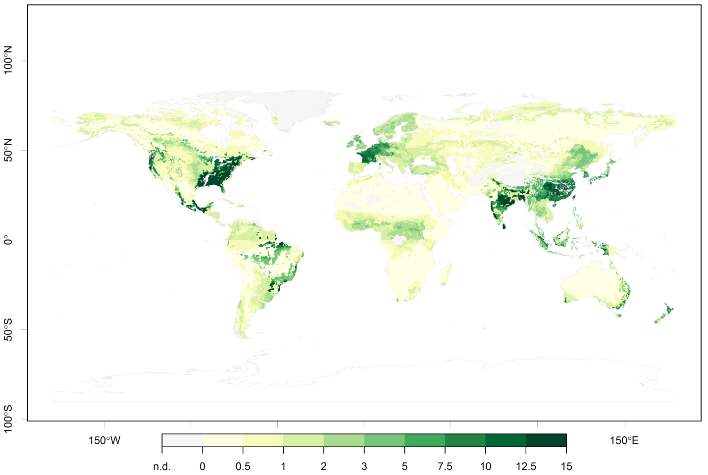 The EPIC model was the best fit for much of Europe and Eastern Asia, where most of the forage production is in intensively-managed grasslands. The EPIC simulations used the same soil and climatic drivers as the CENTURY runs plus topography data (high-resolution global Shuttle Radar Topography Mission digital elevation model (SRTM) and the Global 30 Arc Second Elevation Data (GTOPO30). Warm and cold seasonal grasses were simulated in EPIC, and the simulations included a range of management intensities represented by different levels of nitrogen fertilizer inputs and off-take rates. The most intensive management minimizing nitrogen stress and applying 80% off-take rates (EPIC_INT) was found to be the best match for South Korea. Highly fertilized grasslands but with an off-take rate of 50% only were identified in Western Europe, China and Japan (EPIC_MID), and finally extensive management, only partially satisfying the nitrogen requirements and considering 20% off-take rates corresponded best to Central and Northern Europe and South-East Asia (EPIC_EXT). The resulting hybrid forage availability map is represented in Fig. 21.