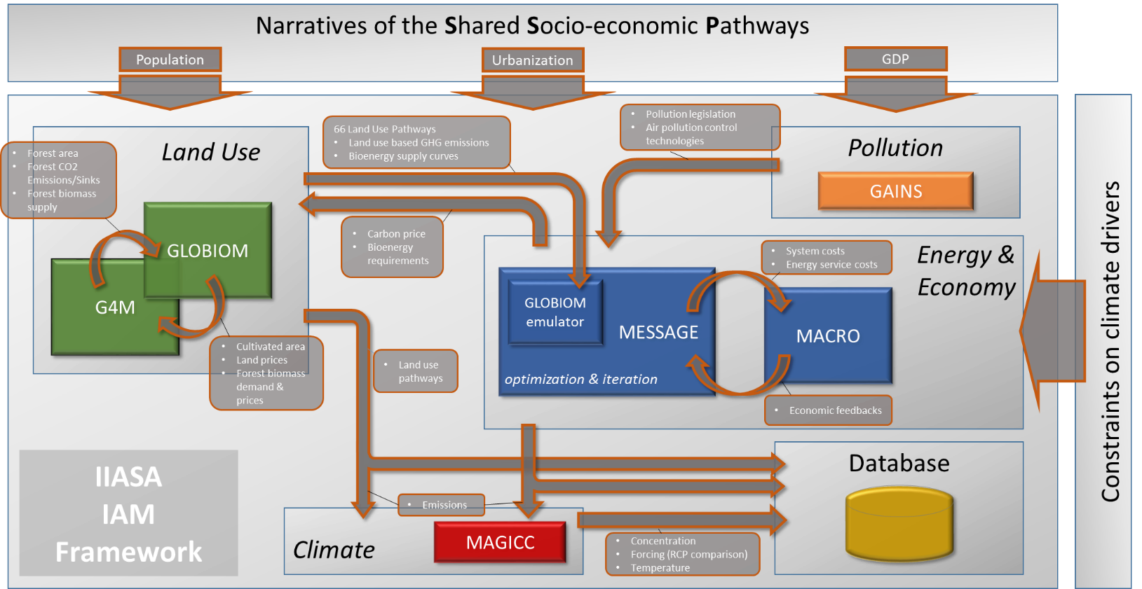 The IIASA IAM framework consists of a combination of five different models or modules - the energy model MESSAGEix, the land use model GLOBIOM, the air pollution and GHG model GAINS, the aggregated macro-economic model MACRO and the simple climate model MAGICC - which complement each other and are specialized in different areas. All models and modules together build the IIASA IAM framework, also referred to as MESSAGEix-GLOBIOM owing to the fact that the energy model MESSAGEix and the land use model GLOBIOM are its central components. The five models provide input to and iterate between each other during a typical scenario development cycle. Below is a brief overview of how the models interact with each other, specifically in the context of developing the SSP scenarios.